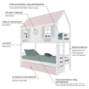Diferenciais: Casinha e Telhado com fechamento em MDF, Fechamento Coração, Janela e Cachepô, 02 Gavetas com Rodízios.