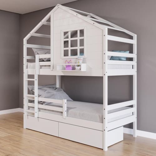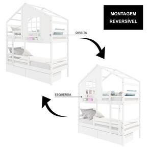 Diferenciais: Escada Fixa, 02 Gavetas, Casinha com fechamento em MDF, Janela e Prateleira para Livros e Decoração, Grade de Proteção Removível, Montagem Reversível (Lado Direito ou Lado Esquerdo)
