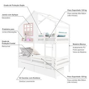 Diferenciais: Escada Fixa, 02 Gavetas, Grade de Proteção Removivel, Casinha com fechamento em MDF, Janela e Prateleira para Livros e Decoração, Montagem Reversível (Lado Direito ou Lado Esquerdo)