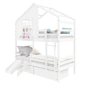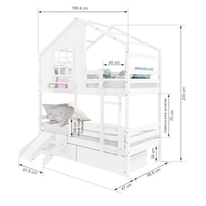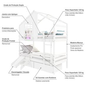 Diferenciais: Escada Fixa, 02 Gavetas, Casinha com fechamento em MDF, Janela e Prateleira, Grade de Proteção Removível, Kit escada/escorregador, Montagem Reversível (Lado Direito ou Lado Esquerdo)