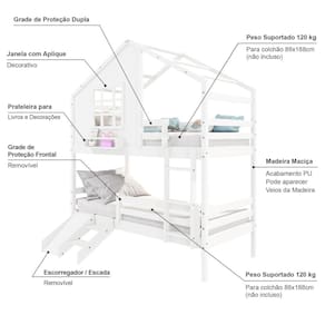 Diferenciais: Escada Fixa, Casinha com fechamento em MDF, Janela e Prateleira para Livros e Decoração, Kit Escada/Escorregador, Grade de Proteção Removível, Montagem Reversível (Lado Direito ou Lado Esquerdo)