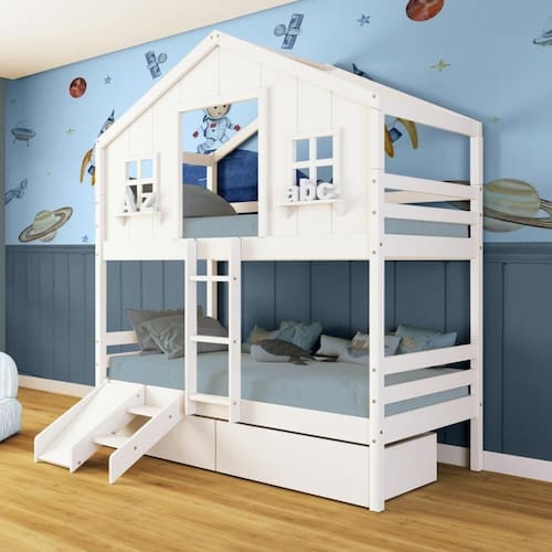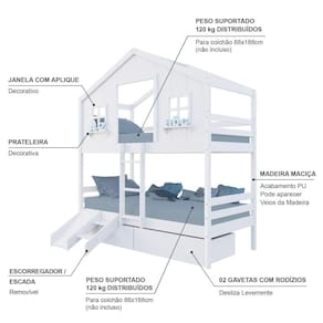 Diferenciais: Escada Fixa, Casinha com fechamento em MDF, Janela e Prateleira Decorativa, 02 Gavetas com Rodízios, Kit Escada e Escorregador.