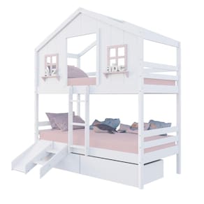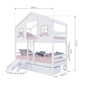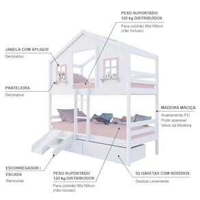 Diferenciais: Escada Fixa, Casinha com fechamento em MDF, Janela e Prateleira Decorativa, 02 Gavetas com Rodízios, Kit Escada e Escorregador.