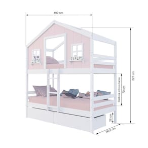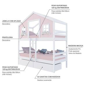 Material Principal: Madeira Maciça | Cor Predominante: Rosa/ Branco | Necessita Montagem: Sim | Acompanha Colchão: Não | Tipo de Cama: Beliche | Altura: 227 | Largura: 96,6 | Comprimento: 199 | Peso: 87 | Peso máximo suportado: 120 | Cor Via: Rosa/ Branco | Peso com Embalagem: 87 | Comprimento com Embalagem: 192 | Largura com Embalagem: 30 | Altura com Embalagem: 30 | Tamanho da Cama: Beliche Solteiro | Descrição do Tamanho: Beliche Solteiro | Quantidade de Caixas: 05