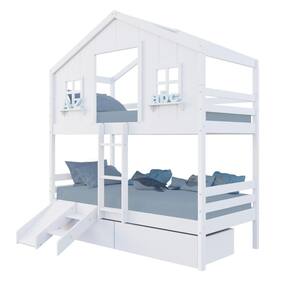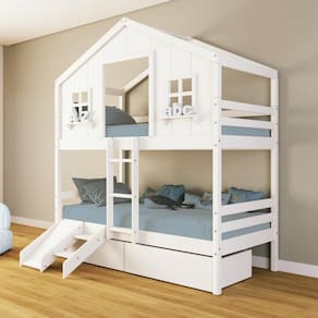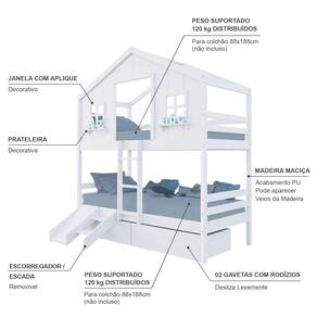 Diferenciais: Escada Fixa, Casinha com fechamento em MDF, Janela e Prateleira Decorativa, 02 Gavetas com Rodízios, Kit Escada e Escorregador.