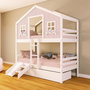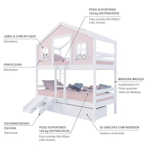 Diferenciais: Escada Fixa, Casinha com fechamento em MDF, Janela e Prateleira Decorativa, 02 Gavetas com Rodízios, Kit Escada e Escorregador.