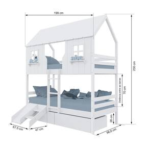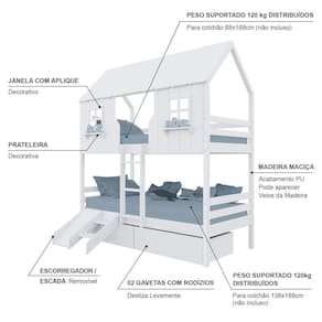 Diferenciais: Escada Fixa, Casinha e Telhado com fechamento em MDF, Janela e Prateleira Decorativa, 02 Gavetas com Rodízios, Kit Escada/ Escorregador.