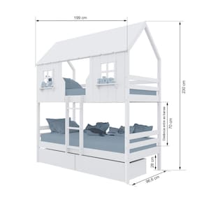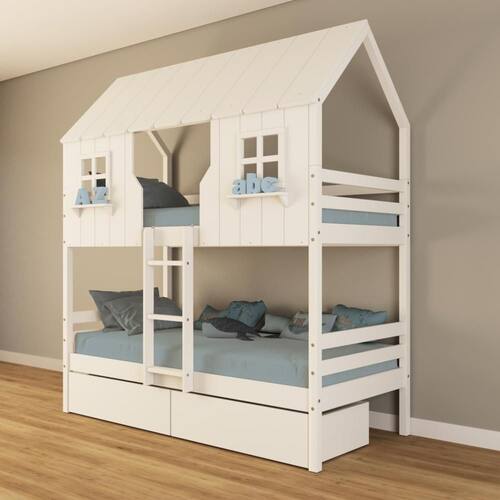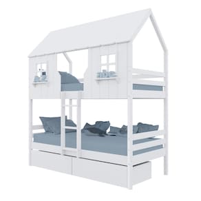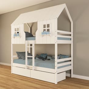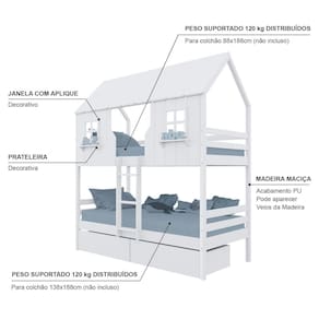 Diferenciais: Escada Fixa, Casinha e Telhado com fechamento em MDF, Janela e Prateleira Decorativa, 02 Gavetas com Rodízios.