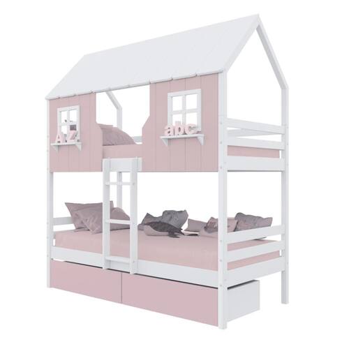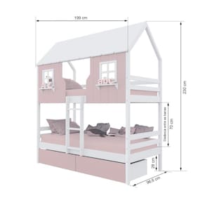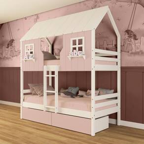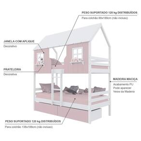 Diferenciais: Escada Fixa, Casinha e Telhado com fechamento em MDF, Janela e Prateleira Decorativa, 02 Gavetas com Rodízios.