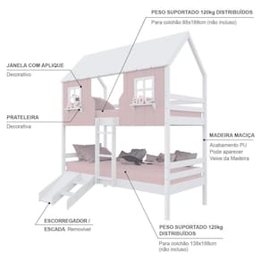 Material Principal: Madeira Maciça | Cor Predominante: Rosa/ Branco | Necessita Montagem: Sim | Acompanha Colchão: Não | Tipo de Cama: Beliche Solteiro | Altura: 230 | Largura: 96,6 | Comprimento: 199 | Peso: 83 | Peso máximo suportado: 120 | Cor Via: Rosa/ Branco | Peso com Embalagem: 83 | Comprimento com Embalagem: 192 | Largura com Embalagem: 30 | Altura com Embalagem: 30 | Tamanho da Cama: Beliche Solteiro | Descrição do Tamanho: Beliche Solteiro | Quantidade de Caixas: 05