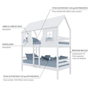 Material Principal: Madeira Maciça | Cor Predominante: Branco | Necessita Montagem: Sim | Acompanha Colchão: Não | Tipo de Cama: Beliche Solteiro | Altura: 230 | Largura: 96,6 | Comprimento: 199 | Peso: 78 | Peso máximo suportado: 120 | Cor Via: Branco | Peso com Embalagem: 78 | Comprimento com Embalagem: 192 | Largura com Embalagem: 30 | Altura com Embalagem: 30 | Tamanho da Cama: Beliche Solteiro | Descrição do Tamanho: Beliche Solteiro | Quantidade de Caixas: 04