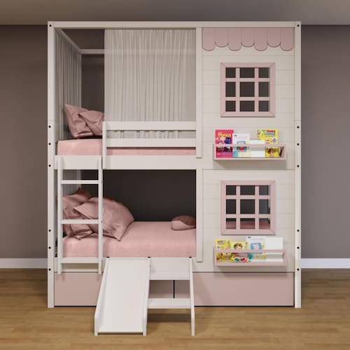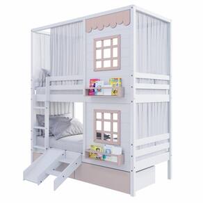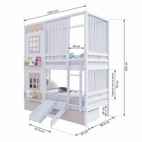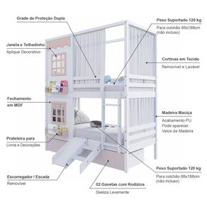 Diferenciais: Escada Fixa, 02 Gavetas, Kit Escada/ Escorregador, Kit Cortina Superior e Inferior, Casinha com fechamento em MDF, 02 Janelas e Prateleira para Livros e Decoração, Montagem Reversível (Lado Direito ou Lado Esquerdo)