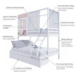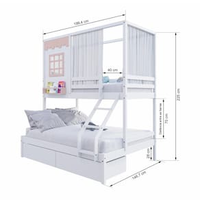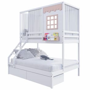 Diferenciais: Escada com Leve Curvatura, Cortina, 02 Gavetas, Casinha com fechamento em MDF, Janela e Prateleira para Livros e Decoração,Montagem Reversível (Lado Direito ou Lado Esquerdo)