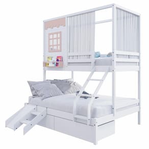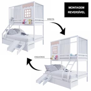 Diferenciais: Escada com Leve Curvatura, 02 Gavetas, Cortina, Kit Escada/ Escorregador, Casinha com fechamento em MDF, Janela e Prateleira para Livros e Decoração, Montagem Reversível (Lado Direito ou Lado Esquerdo)