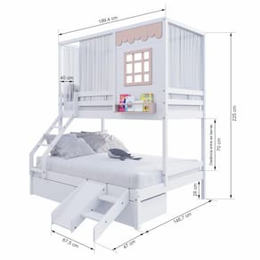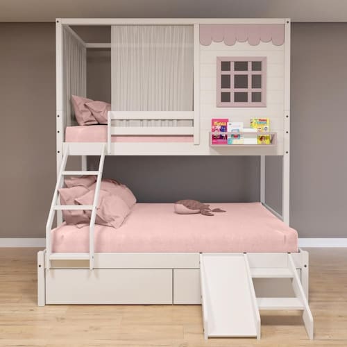 Beliche Casinha Reta Casal/ Solteiro com 02 Gavetas Escorregador e Cortina Madeira Maciça Branco/ Rosa Housin