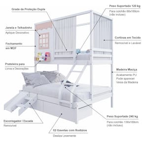 Diferenciais: Escada com Leve Curvatura, 02 Gavetas, Cortina, Kit Escada/ Escorregador, Casinha com fechamento em MDF, Janela e Prateleira para Livros e Decoração,Montagem Reversível (Lado Direito ou Lado Esquerdo)