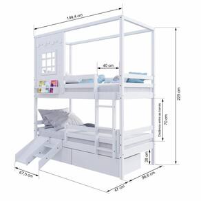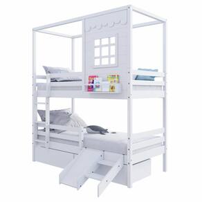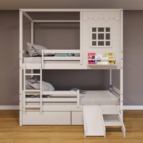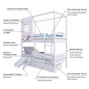 Diferenciais: Escada Fixa, 02 Gavetas, Kit Escada/ Escorregador, Grade de Proteção Removível, Casinha com fechamento em MDF, Janela e Prateleira para Livros e Decoração, Montagem Reversível (Lado Direito ou Lado Esquerdo)