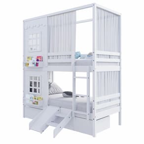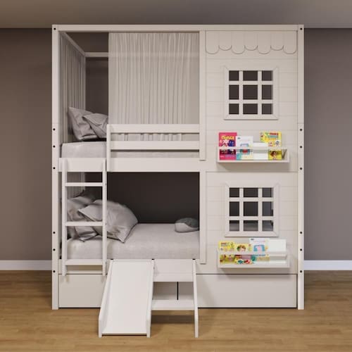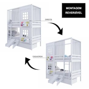 Diferenciais: Escada Fixa, 02 Gavetas, Kit Escada/ Escorregador, Kit Cortina Superior e Inferior, Casinha com fechamento em MDF, 02 Janelas e Prateleira para Livros e Decoração, Montagem Reversível (Lado Direito ou Lado Esquerdo)