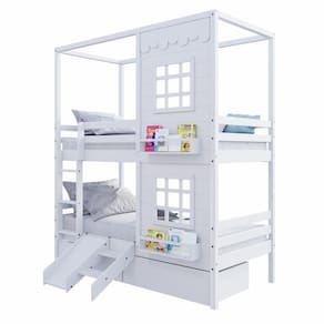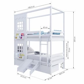 Diferenciais: Escada Fixa, Casinha com fechamento em MDF, 02 Janelas e Prateleira para Livros e Decoração, 02 Gavetas, Kit Escada/ Escorregador, Montagem Reversível (Lado Direito ou Lado Esquerdo)