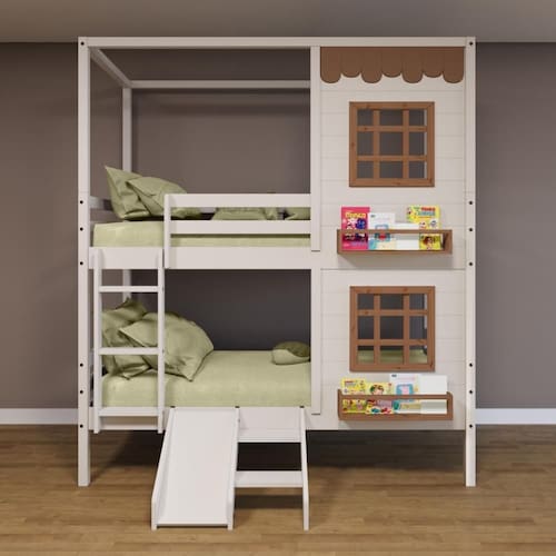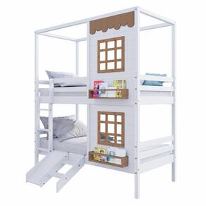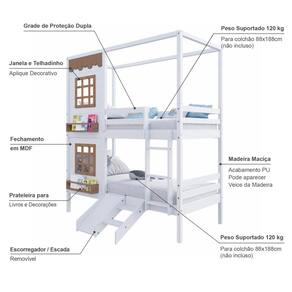 Diferenciais: Escada Fixa, Kit Escada/ Escorregador,, Casinha com fechamento em MDF, 02 Janelas e Prateleira para Livros e Decoração, Montagem Reversível (Lado Direito ou Lado Esquerdo)
