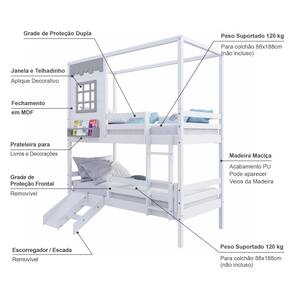 Diferenciais: Escada Fixa, Grade de Proteção Removível, Kit Escada/ Escorregdor, Casinha com fechamento em MDF, Janela e Prateleira para Livros e Decoração, Montagem Reversível (Lado Direito ou Lado Esquerdo)