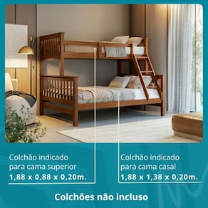? 2 camas em 1 móvel: cama inferior de casal + cama superior de solteiro? Madeira maciça de pinus + MDF: estrutura reforçada e durável? Pintura em laca fosca com 30% de brilho nas cores branco, marrom ou amarelo ouro? Cama superior com grades de proteção para segurança no uso? Capacidade de peso: cama de casal até 240 kg / cama de solteiro até 120 kg? Ideal para quartos pequenos, com design funcional e aproveitamento inteligente de espaço