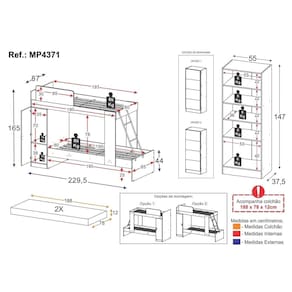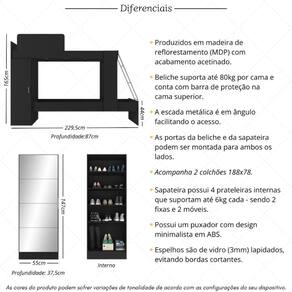 Conteúdo da Embalagem: 1 (um) Beliche 2 (dois) Colchões 1 (uma) Sapateira com Espelho Manual de Montagem Kit Ferragem