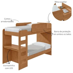 Essa beliche é ideal para quartos que precisam de espaço, com design moderno e soluções funcionais para o dia a dia. Possui barras de protação, luzes de LED e cantos arredondados para sua segurança. Com 5 travessões, distribuindo o peso e aumentando a resistência da cama. Dispositivo antirruído para um ambiente tranquilo, evitando rangidos e barulhos.