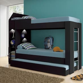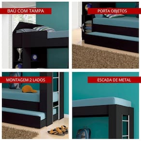 APÓS O PEDIDO FINALIZADO, NÃO ACEITAMOS TROCA DE COR DO PRODUTO E NEM ALTERAÇÃO DE ENDEREÇO DE .A Beliche Ditália com Cama Auxiliar com 3 colchões e Kit Luz é a escolha perfeita para quem busca estilo, conforto e economia de espaço. Ele é versátil, permitindo acomodar a família, amigos ou convidados com facilidade.Além disso, possui uma estante integrada para exibir objetos de decoração e manter seus pertences organizados. A cama auxiliar deslizante maximiza o espaço disponível e pode ser guardada sob o beliche quando não estiver em uso.Outra grande vantagem é o amplo baú de armazenamento integrado, perfeito para guardar roupas de cama, travesseiros e cobertores, mantendo seu quarto arrumado e com espaço extra.Transforme seu quarto em um ambiente acolhedor e prático com o Beliche Ditália.CARACTERÍSTICAS- Revestimento Impressão Ultravioleta (UV) com acabamento alto brilho- Produzido em MDP 15mm- Possui três camas, todas para colchão de tamanho 1,88 x 78 x 12- Possui armário, bau e prateleiras- Cama auxiliar com rodízios- Acompanha 3 colchões- Acompanha 1 Kit luz- Peso: 89,29 Kg- Altura: 154,00 cm- Largura: 85,00 cm- Profundidade: 224,60 cmINFORMAÇÕES DO KIT LUZ- Kit com 3 lâmpadas de LED de 5 watts cada e 1 controle remoto.- 2 níveis de ajuste de brilho, timer de 30 minutos e botão liga/desliga via controle remoto.- É possível também ligar e desligar tocando no interruptor diretamente na lente das luzes.- Fácil fixação com adesivo dupla face.- Alimentado por pilhas AAA (inclusas).- Dimensão das lâmpadas: 9x7x2,1 cm.- Dimensão do controle remoto: 8x5,9x1,5 cmAcompanha kit ferragens e manual de montagem (montagem não inclusa).Este produto é vendido desmontado em 7 volumes, embalado em caixa de papelão com isopor nas laterais e revestidos com plásticos termoencolhível.A fixação é feita por girofix, cavilhas e parafusos, não é necessário parafusar na parede.PERGUNTAS FREQUENTES1 - O produto é entregue montado?Resposta: Nossos produtos são entregues desmontados. Os móveis são acompanhados de todos componentes necessários (manual de montagem, parafusos, pregos, puxadores e etc..) para que possam ser montados com facilidade.2 - Vocês oferecem serviço de montagem?Resposta: Não disponibilizamos este serviço.3 - Qual o valor da ?Resposta: O valor referente a dependerá do destino final da mercadoria, para calcular o valor, é considerado o CEP do consumidor.4 - Os produtos são s?Resposta: Sim, trabalhamos apenas com produtos s.5 - Vocês atendem todos os estados do Brasil?Resposta: Sim, enviamos nossos produtos para todo o Brasil.6 - Os colchões acompanham o produto?Resposta: Sim, os colchões acompanham o produto.7- Acompanha kit luz?Resposta:Sim, acompanha 1 kit luz.LIMPEZALimpar utilizando apenas pano umedecido com água, nunca utilizar abrasivos ou esponjas de aço.GARANTIAGarantia de 3 meses (contra defeitos de fabricação).OBSERVAÇÕES- Montar o móvel com o produto virado de costas, para montagem, forrar o chão com o papelão das embalagens.- Não expor o móvel a fontes de calor ou de umidade.- As imagens indicam uma sugestão de uso e são apenas ilustrativos, os objetos decorativos não estão inclusos.- As cores dos produtos podem variar devido à reprodução sobre a tela do dispositivo.