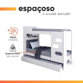 MODELO: Beliche com Cama Auxiliar Floripa MARCA: J&A Móveis COR: Branco ACABAMENTO: Pintura UV (Ultravioleta) MATERIAL: MDF/MDP com madeira proveniente de reflorestamento DIFERENCIAL: Beliche com nicho organizador. Cama Auxiliar possui sistema de rodízios deslizantes PESO: 78,6kg SISTEMA DE MONTAGEM: Parafusos BELICHE SUPORTA: 60kg (cada cama) CAMA AUXILIAR: 60kg TAMANHO: Para colchões de solteiro: 0,88m (Solteiro)