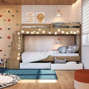 O quarto da sua ou suas crianças ficará ainda mais charmoso com a nossa Cama Beliche da Completa Móveis. Com escadas laterais, uma praticidade para a subida e descida do seu pequeno. Em cada degrau, nichos que facilitam e otimizam o espaço. Nestes nichos, podes guardar e organizar vários brinquedos, livros e outros acessórios. Nos últimos dois nichos rentes ao chão, duas gavetas que acompanham o produto e o tornam ainda mais completo! Permite a montagem da escada lateral tanto do lado direito quanto lado esquerdo. Para completar e sofisticar ainda mais o produto, acompanha dois gavetões inferiores, podendo assim armazenar o restante das coisas do quarto, sejam roupas de cama, outros brinquedos, etc. Opcional em várias combinações de cores, confira! Produto 100% MDP em 15 milímetros de espessura! O produto é entregue desmontado. Use um pano levemente umedecido com água, seguido de pano seco. Não utilize produtos químicos ou abrasivos.
