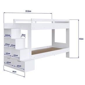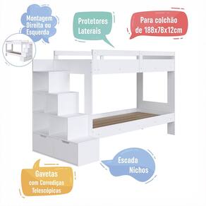 Características Estrutura em MDP Acabamento Fosco Estrado Lastros em MDF cru Escadas Laterais Podem ser Montadas lado Direito/Esquerdo Protetores Laterais na Cama Superior Sapatas Plásticas 05 Nichos 02 Gavetas com Corrediças Telescópicas Metálicas Puxadores embutidos Beliche Suporta até 60 kg sem Impacto cada Andar IDEAL PARA COLCHÃO 188 X 78cm NÃO ACOMPANHA COLCHÃO