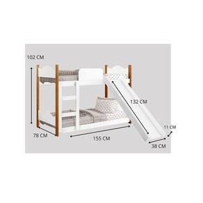 Dimensões do Produto Montado: Altura: 102 cm Largura: 78 cm Profundidade: 155 cm Observações: - Material: MDF/MDP - Acabamento: Brilho - Peso Suportado: 60 kg distribuídos sobre o produto - Ideal para colchões: 68 x 148 x 12cm - Vem com escada e grade de proteção lateral na cama superior - Acompanha escorregador - Garantia de 3 meses pelo Fabricante Informações adicionais: - Verifique o tamanho e os detalhes do produto antes de realizar a compra. - As fotos são meramente ilustrativa. Objetos decorativos que aparecem nas imagens não acompanham o produto. - A transportadora entregará o produto no portão e/ou portaria da residência, ou ainda, somente no andar térreo, em caso de prédios, do endereço de entrega. - Avaliar a mercadoria no ato do recebimento e recusar em caso de divergência ou avarias
