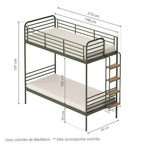 um quarto funcional, moderno e cheio de personalidade. Acabamento dos Pés: Pintura Acompanha Cama Auxiliar: Não Acompanha Colchão: Não Altura do Estrado até o Chão: 33 cm Altura do Estrado Superior até o Chão: 144 cm Altura dos Pés: 33 cm Ambiente Principal: Quarto Infantil codigo_ean: 7900288146052 Complexidade da Montagem: Alta: deve ser montado por um montador especializado Cor: Verde / Álamo Cor do Produto: Verde / Álamo Escala de Brilho: Semi-Fosco Itens Inclusos: 1 beliche, 1 kit ferragens e 3 manual de montagem Linha ou Coleção: Linha Teko Manual de Montagem e Instalação: https://cdn2.madeiramadeira.com.br/prd/sedlak-representacao/2918197-168-9235a300-b87a-4079-acaa-e5aee549ba20-1747050944.pdf Marca: Casatema Material da Escada: Aço/MDF Material do Estrado: MDF Material dos Pés: Aço Material Principal: Aço Necessita Montagem: Sim Número de Camas: 02 Origem do Produto: Nacional Permite a Utilização de Cama Auxiliar: Sim Peso: 80 kg Peso Suportado por cada cama: 80 kg Possui Escrivaninha: Não Possui Espelhos: Não Possui Grade: Sim Possui Pés: 04 Possui Portas: Não Possui Prateleiras: Não Possui Rodízio: Não Recomendações de Uso, Manutenção e Limpeza: Use um pano macio, levemente umedecido com água. Não utilize solventes ou abrasivos.Para garantir estabilidade e durabilidade, é recomendado reapertar os parafusos de tempos em tempos. Sapatas Niveladoras: Não Sistema de Montagem: Parafusos Suporta Até (kg): 160 kg Tamanho da Cama: Solteiro Tamanho do Colchão Indicado (L x C): 88x188cm Tipo de Cama: Beliche Tipo de Colchão: Solteiro Tipo de Estrado: Fixo Trava de Segurança: Não