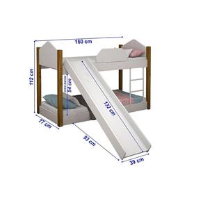 Dimensões do Produto Montado: Altura: 112 cm Largura: 76,5 cm Profundidade: 160 cm Dimensões escorregador: Altura: 132 cm Largura: 110 cm Profundidade: 39 cm Observações: - Material: MDF 15mm / Estrado Madeira Pinus - Pés 5x5 cm em Madeira - Pintura Verniz - Tamanho da Cama: Juvenil - Ideal para Colchões: 68 x 148 x 12cm - Peso Suportado: 50 kg por cama - Acompanha 2 colchões 68 x 148 x 12cm Mais informações - Entre barras: 55 cm Informações adicionais: - Verifique o tamanho e os detalhes do produto antes de realizar a compra. - As fotos são meramente ilustrativa. - A transportadora entregará o produto no portão e/ou portaria da residência, ou ainda, somente no andar térreo, em caso de prédios, do endereço de entrega. - Avaliar a mercadoria no ato do recebimento e recusar em caso de divergência ou danos. - Não nos responsabilizamos pela montagem e desmontagem do produto no ato da entrega e devolução, assim como os custos gerados nestas situações. - Sugerimos a contratação de um montador profissional para a montagem do produto. Não nos responsabilizamos por danos causadas no ato da montagem.