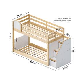 Transforme o quarto com o Beliche New Garden, um espaço de descobertas e segurança. Com estrutura em madeira maciça, garante durabilidade e se destaca pela praticidade e funcionalidade. Os degraus com espaço de armazenamento otimizam o ambiente e facilitam a organização. Para um toque de magia, o LED no corrimão da escada cria uma iluminação suave e convidativa. As camas são para colchões de solteiro (188x88cm), com altura máxima de 15cm para o colchão superior, e cada cama suporta até 100kg. O beliche se adapta às suas necessidades, a janelinha superior pode ser montada para o lado direito ou esquerdo, ainda podemos retirar a janelinha e montar em seu lugar o escorregador (VENDIDO SEPARADAMENTE). Acompanha Cama Auxiliar: Não Acompanha Colchão: Não Acompanha Grade de Proteção: Sim Altura do Estrado até o Chão: 6 cm Ambiente Principal: Quarto Infantil codigo_ean: 7900288209795 Complexidade da Montagem: Média: pode ser montado por mais de uma pessoa e/ou necessite de maior conhecimento para montagem Cor: Natural/Branco Cor do Produto: Natural/Branco Escala de Brilho: Semi-Fosco Informações Complementares: Altura máx. indicada para o colchão da cama superior é de 15cm. Grades acompanham somente na parte superior do produto. Itens Inclusos: 1 Beliche, kit ferragens e manual de montagem Linha ou Coleção: New Garden Manual de Montagem e Instalação: https://product-hub-prd.madeiramadeira.com.br/963558972/documents/a68bc91a-a3f0-4f74-a001-c90ca0dbab7e3125460338717546650252854.pdf Marca: Casatema Material da Cabeceira: MDF Material do Estrado: Madeira Maciça Material Principal: Madeira Maciça modular: Não Necessita Montagem: Sim Origem do Produto: Nacional Permite a Utilização de Cama Auxiliar: Não Peso: 85 kg Possui Baú: Não Possui Gavetas: Não Possui Pés: Não Possui Portas: Não Possui Prateleiras: Não Recomendações de Uso, Manutenção e Limpeza: Na limpeza não utilizar produtos químicos e abrasivos, usar apenas com pano umedecido, para garantir a maior durabilidade do móvel. Sistema de Montagem: Parafusos Suporta Até (kg): 200 kg Tamanho da Cama: Solteiro Tamanho do Colchão Indicado (L x C): 88cm x 188cm Tipo de Cama: Beliche Tipo de Colchão: Solteiro Tipo de Estrado: Fixo Tipo de Grade de Proteção: Grade Tipo de Madeira Maciça: Pinus