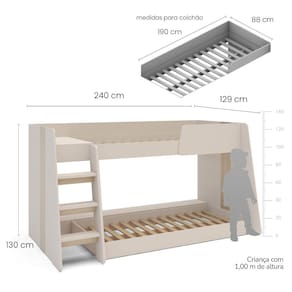 Caracteristicas: Material MDP Acabamento Pintura UV Material do estrado em MDF Com escada Protecao lateral Indicacao do colchao de 88x188cm Peso suportado das camas