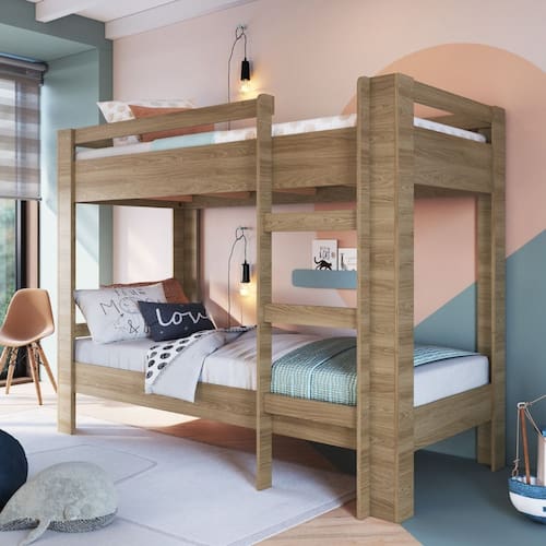Beliche Infantil Slim Completa Moveis e a opcao ideal para deixar o quarto das criancas mais bonito e funcional. Com design moderno, escada lateral reversivel e estrutura em 100 MDP de 15 mm, oferece seguranca, praticidade e durabilidade, sendo indicada para colchao de solteiro 188 x 78 cm.