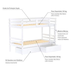 Material Principal: Madeira Maciça | Cor: Branco | Necessita Montagem: Sim | Acompanha Colchão: Não | Tipo de Cama: Beliche