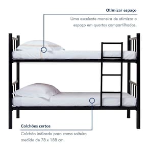 A beliche de solteiro é fácil de montar? Sim, a montagem é simples e prática. Acompanha Cama Auxiliar: Não Acompanha Colchão: Não Altura do Estrado até o Chão: 150 cm Ambiente Principal: Quarto Infantil codigo_ean: 7900288279019 Complexidade da Montagem: Média: pode ser montado por mais de uma pessoa e/ou necessite de maior conhecimento para montagem Cor: Preto Cor do Produto: Preto Escala de Brilho: Super Brilho Itens Inclusos: 1 Beliche, Kit Ferragens e Manual de Montagem Manual de Montagem e Instalação: https://product-hub-prd.madeiramadeira.com.br/728067589/documents/fecab80d-8cba-403a-8f33-1e423ea4fe0c3283373554117610500247928.pdf Marca: Prima Design Material do Estrado: Eucalipto Material Principal: Aço modular: Não Necessita Montagem: Sim Origem do Produto: Nacional Permite a Utilização de Cama Auxiliar: Sim Peso: 41 kg Possui Baú: Não Possui Casinha: Não Possui Estante: Não Possui Gavetas: Não Possui Pés: Não Possui Portas: Não Possui Prateleiras: Não Recomendações de Uso, Manutenção e Limpeza: Para uso de um ocupante por cama. Idade mínima recomendada: 6anos. O colchão deve ser do tamanho correto, sem espaço sobrando na cabeceira ou no pé da cama. Sempre mantenha o beliche em perfeitas condições, principalmente a escada e as ripas do estrado. Sistema de Montagem: Parafusos Suporta Até (kg): 120 kg Tamanho do Colchão Indicado (L x C): 188x78 Tipo de Cama: Beliche Tipo de Colchão: Infantil Tipo de Estrado: Removível Marca: Não Informado