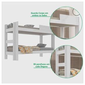 Beliche Isabela Com Estrutura de MDF e MDP Sallêto Precisando deixar o quarto mais funcional? O Beliche Isabela da Sallêto é ideal para quem precisa acomodar, no mesmo quarto, mais de uma pessoa confortavelmente. Esse modelo possui guarda-corpo possibilitando maior segurança. Além disso, o estrado é reforçado e as escadas possuem degraus resistentes. É perfeito para espaços compactos! Atenção: A coloração das imagens do produto pode ter diferentes tonalidades dependendo do seu monitor. Ao receber o produto verifique as seguintes informações: Confira a quantidade de caixas e volumes; Consulte se o nome do comprador consta em todas as etiquetas; Verifique se as caixas não apresentam sinais de violação; Sempre confira seu produto no ato da entrega. NÃO nos responsabilizamos pela montagem do produto. Caso resida em apartamento, verificar se todos os volumes possuem tamanhos adequados ao elevador, Caso contrário é necessário solicitar ajuda para entrega de seu produto até seu apartamento. As imagens são ilustrativas e o produto mencionado nessa compra é o produto do título. Atenção: Colchão não incluso!
