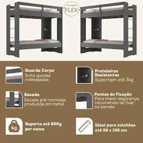 Beliche Juvenil Savana 1 Prateleira Grafite Espresso Móveis. Beliche solteiro com prateleira integrada em nogal. Design moderno e funcional. Ideal para economizar espaço. Fabricado pela Espresso Móveis. Durável e resistente. Opção versátil para quartos compartilhados. Entrega rápida e garantia de qualidade. Acabamento da Prateleira: Finish Foil Acompanha Cama Auxiliar: Não Acompanha Colchão: Não Altura do Estrado até o Chão: 42 cm Ambiente Principal: Quarto codigo_ean: 7909903591239 Complexidade da Montagem: Média: pode ser montado por mais de uma pessoa e/ou necessite de maior conhecimento para montagem Cor: Grafite Cor do Produto: Grafite Escala de Brilho: Fosco Escala de Brilho da Prateleira: Fosco Itens Inclusos: Produto + Kit Ferragem + Manual de Montagem Manual de Montagem e Instalação: https://product-hub-prd.madeiramadeira.com.br/892120/documents/62809903-dee6-4cac-bf0b-58a2411988ec9842manualdemontagemcm1230.pdf Material da Prateleira: MDP Material do Estrado: MDF Material Principal: MDP modular: Não Montagem Flex: Sim Necessita Montagem: Sim Origem do Produto: Nacional Permite a Utilização de Cama Auxiliar: Sim Peso: 85 kg Peso Máximo por Prateleira: 3 kg Possui Baú: Não Possui Escrivaninha: Não Possui Gavetas: Não Possui Pés: Não Possui Portas: Não Possui Prateleiras: Sim Recomendações de Uso, Manutenção e Limpeza: Para Limpeza Utilizar Pano Seco Sistema de Montagem: Minifix, Parafusos e Cavilhas Suporta Até (kg): 80 kg Tamanho da Cama: Solteiro Tamanho do Colchão Indicado (L x C): 88x188 Tipo de Cama: Beliche Tipo de Colchão: Solteiro Tipo de Estrado: Fixo