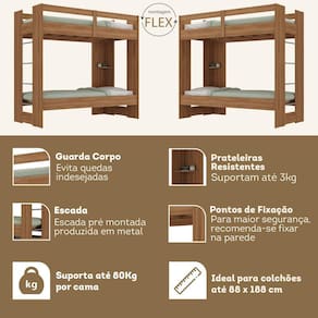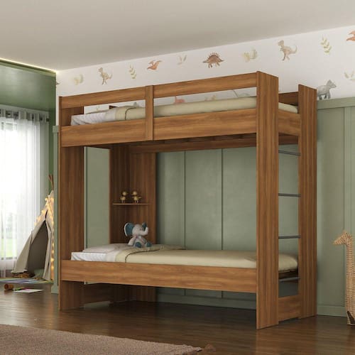 Beliche Juvenil Savana 1 Prateleira Nogal Espresso Móveis. Beliche solteiro com prateleira integrada em nogal. Design moderno e funcional. Ideal para economizar espaço. Fabricado pela Espresso Móveis. Durável e resistente. Opção versátil para quartos compartilhados. Entrega rápida e garantia de qualidade. Acabamento da Prateleira: Finish Foil Acompanha Cama Auxiliar: Não Acompanha Colchão: Não Altura do Estrado até o Chão: 42 cm Ambiente Principal: Quarto codigo_ean: 7909903591246 Complexidade da Montagem: Média: pode ser montado por mais de uma pessoa e/ou necessite de maior conhecimento para montagem Cor: Nogal Cor do Produto: Nogal Escala de Brilho: Fosco Escala de Brilho da Prateleira: Fosco Itens Inclusos: Produto + Kit Ferragem + Manual de Montagem Manual de Montagem e Instalação: https://product-hub-prd.madeiramadeira.com.br/892121/documents/ae989b57-8088-41ba-9617-1452a31e3c949842manualdemontagemcm1230.pdf Material da Prateleira: MDP Material do Estrado: MDF Material Principal: MDP modular: Não Montagem Flex: Sim Necessita Montagem: Sim Origem do Produto: Nacional Permite a Utilização de Cama Auxiliar: Sim Peso: 85 kg Peso Máximo por Prateleira: 3 kg Possui Baú: Não Possui Escrivaninha: Não Possui Gavetas: Não Possui Pés: Não Possui Portas: Não Possui Prateleiras: Sim Recomendações de Uso, Manutenção e Limpeza: Para Limpeza Utilizar Pano Seco Sistema de Montagem: Minifix, Parafusos e Cavilhas Suporta Até (kg): 80 kg Tamanho da Cama: Solteiro Tamanho do Colchão Indicado (L x C): 88x188 Tipo de Cama: Beliche Tipo de Colchão: Solteiro Tipo de Estrado: Fixo