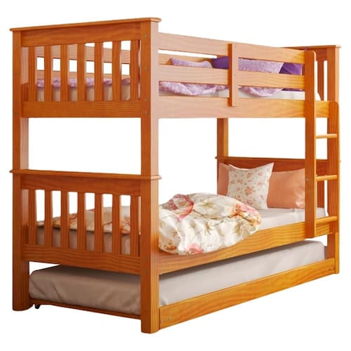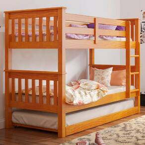 Madeira Maciça de Pinus e EucaliptoBeliche Cama Auxiliar 730X715LA alinhando conforto e funcionalidade em um móvel clássico! Com estrutura 100% em Madeira Maciça de Pinus (sendo os lastros em Madeira de Eucalipto 2,3 cm) e acabamento UV Acetinado. Composta por camas reforçadas e cama auxiliar, escada fixa (não removível pós instalação) e pés com espessura de 6,3 cm. O espaçamento entre as camas é de 67 cm, suportando até 80kg na superior, 100kg na inferior e 100kg na cama auxiliar, ambas ideais e indicadas para colchões de 188x88 cm. NÃO ACOMPANHA COLCHÃO NEM DEMAIS DECORAÇÕES. Produto será entregue em 4 volumes.