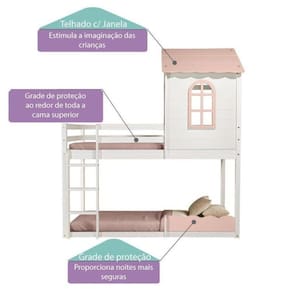 A cama superior é cercada por toda as laterais com barras e a cama inferior com grade de proteção, garantindo noites mais seguras. A escada com 3 degraus na parte frontal. O painel com janelinha e o telhado casinha, deixam a cama mais divertida e lúdica. A cama da parte debaixo é no método montessoriano, onde a independência da criança é livre, podendo sozinha, subir e descer da cama. Um móvel incrível para fazer do quarto o local mais divertido da casa. Esse móvel poderá acompanhar as diferentes fases da criança, iniciando na infância e passando pela juvenil. Acompanha Colchão: Não Altura do Conjunto: 224 cm Ambiente: null Ambiente Principal: Quarto Infantil Cor: Branco/Rosa Informação Complementar: 1x Cama Alta Infantil Club House Sweet Branco/RosaLargura: 202Altura: 224Peso: 51.5Profundidade: 111Necessita Montagem: Sim1x Kit Estrado com Grade para Cama Club House Sweet Branco/RosaLargura: 89Altura: 1.7Peso: 5.5Profundidade: 190Necessita Montagem: Sim Material Principal: Madeira Maciça Permite a Utilização de Cama Auxiliar: Não Possui Portas: Não