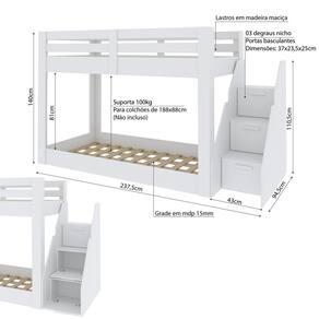 Com esse móvel você garante não só que duas pessoas tenham um lugar especial na hora do descanso, como consegue dar aquele charme extra na decoração do ambiente. Produto Montado: Sim Acabamento dos Pés: BP Acompanha Cama Auxiliar: Não Acompanha Colchão: Não Altura do Estrado até o Chão: 1,5 cm Altura do Estrado Superior até o Chão: 94.0000 Altura dos Pés: 1,5 cm Altura Máxima dos Pés: 1.5000 Ambiente Principal: Quarto codigo_ean: 7909903617144 Complexidade da Montagem: Alta: deve ser montado por um montador especializado Comprimento: 237,5 cm Cor: Branco Perfect Wood Cor do Produto: Branco Perfect Wood Cor Flex: Não Escala de Brilho: Semi-Brilho Escala de Brilho da Porta: Semi-Brilho Informações Complementares: - Fazer uma verificação mensal e realizar o reaperto dos parafusos do produto, caso necessário. - Proibido pular sobre as camas. - O produto destina-se ao uso de uma pessoa por cama sempre. O produto jamais deverá ser utilizado por mais de uma pessoa por cama Itens Inclusos: 1 Beliche + Kit de ferragens + manual de montagem Manual de Montagem e Instalação: https://product-hub-prd.madeiramadeira.com.br/898343/documents/ea9e198a-6a77-4a75-b7ec-8b91059fc851sorianaSolteiroBrancoCopia.pdf Marca: Casatema Material da Porta: MDP Material do Estrado: Madeira Multilaminada Material do Puxador da Porta: MDF Material dos Pés: Plástico Material Principal: MDP Montagem Flex: Não Necessita Montagem: Sim Número de Camas: 02 Origem do Produto: Nacional Permite a Utilização de Cama Auxiliar: Não Peso: 96,2 kg Peso Suportado por cada cama: 100.0000 Possui Baú: Não Possui Escrivaninha: Não Possui Espelhos: Não Possui Gavetas: Não Possui Grade: Sim Possui Nichos: Não Possui Pés: 18 Possui Portas: Sim Possui Prateleiras: Não Possui Rodízio: Não Quantidade de Portas: 03 Recomendações de Uso, Manutenção e Limpeza: Limpar com pano umedecido, sem adição de produtos químicos. Sapatas Niveladoras: Não Sistema de Montagem: Profissional Qualificado Tamanho da Cama: Solteiro Tamanho do Colchão Indicado (L x C): 88x188 Tipo de Cama: Beliche Tipo de Colchão: Solteiro Tipo de Dobradiça/Corrediça da Porta: Metálica Tipo de Estrado: Fixo Tipo de Porta: Misto (Bater e Basculante) Tipo de Puxador da Porta: Externo Trava de Segurança: Não