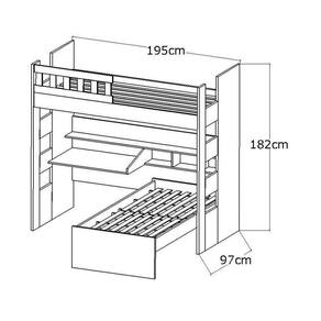 Cama Alta com Escrivaninha:195 x 182 x 97cm (L x A x P).