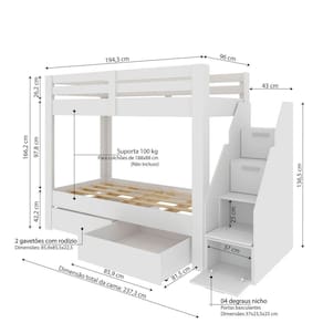 Com design moderno, conta com uma escada lateral, sendo que cada degrau possui um nicho organizador, que auxilia na otimização dos espaços. Para ficar ainda mais perfeita, possui dois gavetões com rodízios, a baixo da cama inferior, que oferecem um sistema de armazenamento prático e fácil de usar. Além disso, permite a montagem da escada tanto do lado direito quanto do lado esquerdo.