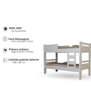Transforme o quarto infantil com esta beliche solteiro branca, ideal para quem busca praticidade, segurança e um visual clean. Fabricada em MDF de alta qualidade, ela oferece resistência e durabilidade, sendo perfeita para acomodar duas crianças ou adolescentes com conforto.