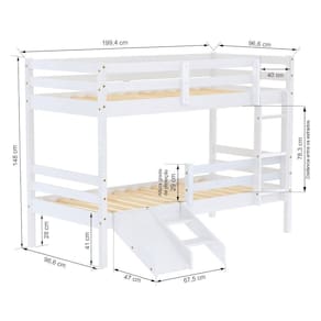 Material Principal: Madeira | Cor Predominante: Branco | Necessita Montagem: Sim | Acompanha Colchão: Não | Tipo de Cama: Beliche | Altura: 148 | Largura: 96,6 | Comprimento: 199,4 | Peso: 71 | Peso máximo suportado: 120 | Cor Via: Branco | Peso com Embalagem: 71 | Comprimento com Embalagem: 192 | Largura com Embalagem: 0,55 | Altura com Embalagem: 0,50 | Tamanho da Cama: Solteiro | Descrição do Tamanho: 96,6 x 148 x 199,4 cm | Quantidade de Volumes: 4